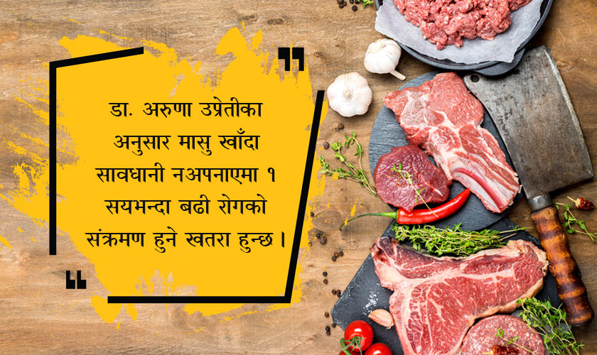 बडादसैँमा अन्य बेलाभन्दा खापपान बढी नै हुन्छ । वर्षभरीमा सन्तुलन मिलाएर खान पुग्ने मासु प्रायः धेरै नेपालीले दसैँको अवधिमा खाने चलन छ । यसपालीको वडादसैँ अरु बेलाको दसैँ भन्दा फरक तरिकाले मनाउँनुपर्ने भएकाले खानपानमा ध्यान दिन जरुरी झन जरुरी भएको पोषणविद् अरुणा उप्रेती बताउँछिन् । कोरोना महामारीको बेलामा शरीरको प्रतिरोधात्मक क्षमता बढाउने खानपिन ध्यान दिन जरुरी हुन्छ । त्यसैले अस्वस्थकर मासुको विभिन्न परिकार बनाएर खादा पेट दुख्ने, फुल्ने, झाडापखाला, आउँ, ‘फुड पोइजनिङ’ लगायतका विभिन्न किसिमका स्वास्थ्यमा समस्या आउन सक्छ । डा. उप्रेतीका अनुसार मासु खाँदा सावधानी नअपनाएमा १ सयभन्दा बढी रोगको संक्रमण हुने खतरा हुुन्छ । मासुजन्य पर्दाथ सेवन गर्दा कसरी गर्ने, कति गर्ने, मासुलाई कसरी ताजा राख्ने भन्ने बारेमा डा. उप्रेतीले यस्तो सल्लाह दिन्छिन् –