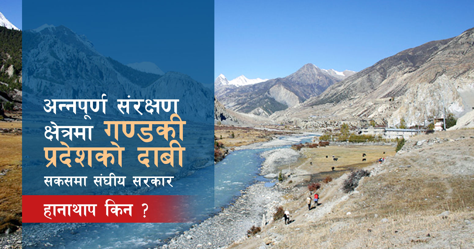 गण्डकी प्रदेशले अन्नपूर्ण संरक्षण क्षेत्र आयोजना (एक्याप)मा दाबी पेस गरेपछि संघ सरकार सकसमा परेको छ । संघ सरकारले अन्तिमपटकका लागि भन्दै व्यवस्थापनको जिम्मा अर्धसरकारी निकाय राष्ट्रिय प्रकृति संरक्षण कोष (एनटिएनसी)लाई दिएकामा गण्डकी प्रदेशले दाबीसहित कार्ययोजना नै पठाएको हो । गण्डकीले अन्नपूर्ण संरक्षण क्षेत्रबाट हुने आम्दानीको ५० प्रतिशत प्रदेश, २५ प्रदेश स्थानीय तह र २५ प्रतिशत आयोजनामा जाने गरी व्यवस्थापनको मोडल पेस गरेको छ ।