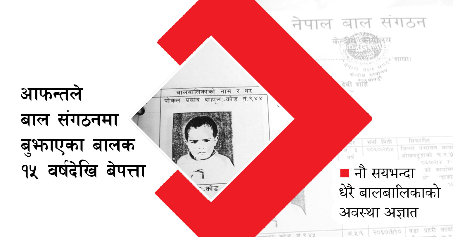 आफन्तले नेपाल बाल संगठनमा बुझाएका एक बालक १५ वर्षदेखि बेपत्ता छन् । खोजबिनका लागि आफन्तले निरन्तर धाउँदा पनि बालकको अवस्था पत्ता लगाउन सकेका छैनन् ।