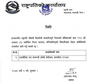 २ भदौ, काठमाडौं । राष्ट्रपति विद्यादेवी भण्डारीले राजनीतिक दलसम्बन्धी अध्यादेश प्रमाणीकरण गरेकी छन् । राष्ट्रपति भण्डारीका स्वकीय सचिव भेषराज अधिकारीले अध्यादेश प्रमाणीकरण भएको जानकारी दिए । दल विभाजनलाई सहज बनाउने गरी मन्त्रिपरिषद्ले मंगलबार अध्यादेश सिफारिस गरेको थियो ।