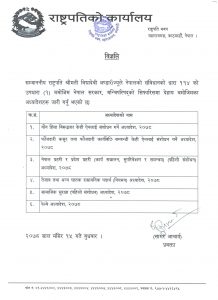 काठमाडौं । राष्ट्रपति विद्यादेवी भण्डारीले विभिन्न ६ वटा अध्यादेश जारी गरेकी छन् । मन्त्रिपरिषद्को सिफारिसमा राष्ट्रपतिले बुधबार संविधानको धारा ११४ को उपधारा (१) बमोजिम अध्यादेशहरू जारी गरेकी हुन् ।