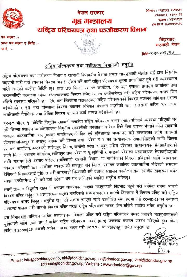विभागले तत्काल विद्युतीय राहदानी बनाउन आवश्यक नभएका सेवाग्राहीले भीडभाड नहुने गरी क्रमिक रुपमा आफ्नो विवरण प्रविष्ट गर्न र अत्यावश्यक भएका नागरिकले सम्भव भएसम्म आफ्नो जिल्लामा नै विवरण प्रविष्ट गरी राष्ट्रिय परिचयपत्र नम्बर लिन अनुरोध गरेको छ । मंसिर १ गतेदेखि विद्युतीय राहदानी बनाउँदा राष्ट्रिय परिचयपत्र नम्बर अनिवार्य गरिएको छ ।