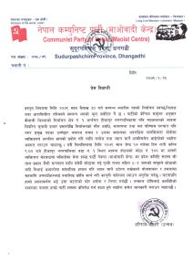 नेकपा माओवादी केन्द सुदूरपश्चिम प्रदेश समिति र टीकापुर नगर समितिले शनिबार छुट्टाछुट्टै विज्ञप्ति जारी गरी कारवाहीको माग गरेको हो । कारवाही नगरिए तत्काल आन्दोलन गरिने समेत चेतावनी विज्ञप्तिमा दिइएको छ ।