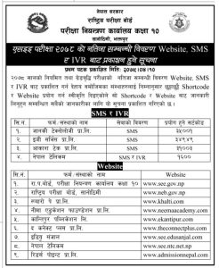 एसइईको नतिजा परीक्षार्थीले बोर्डको वेबसाइटका साथै एसएमएस र आइभीआरबाट पनि हेर्न सकिने व्यवस्था गरेको छ । परीक्षा नियन्त्रक कार्यालयले नियमित तथा ग्रेडवृद्धि परीक्षाको नतिजा वेबसाइट, एसएमएस र आइभीआरबाट हेर्न सकिने जानकारी दिएको छ ।