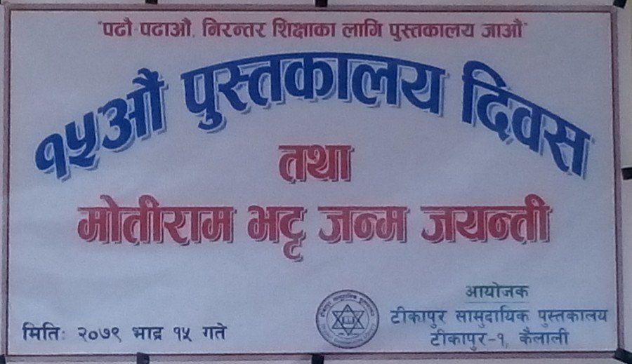 टीकापुर/ पढौं पढाऔं, निरन्तर शिक्षाका लागि पुस्तकालय जाऔं भन्ने मुल नाराका साथ टीकापुर सामुदायिक पुस्तकालयको आयोजनामा १५ औं पुस्तकालय दिवस तथा मोति जयन्ती मनाइएको छ ।