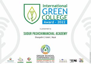 धनगढी/धनगढीको सुदूरपश्चिमाञ्चल एकेडेमी (एसपीए) कलेजले अमेरिकाको न्यूयोर्क शहरमा आयोजित एक भव्य समारोहका बीच अन्तर्राष्ट्रिय ग्रीन कलेज अवार्ड-२०२२ हात पारेको छ ।
