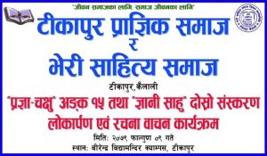 टीकापुर, ९ फागुन/टीकापुर प्राज्ञिक समाज र भेरी साहित्य समाजको संयुक्त आयोजनामा मंगलवार टीकाुरमा पुस्तक लोकार्पण तथा रचना वाचन कार्यक्रम भएको छ ।